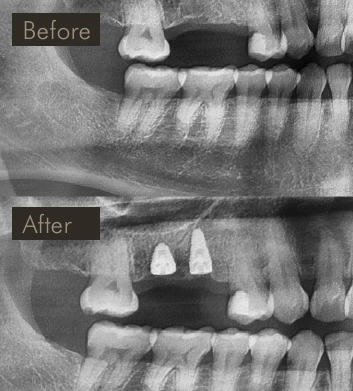 » X-ray image showing before & after placement of implants in upper right to replace 2 missing teeth.